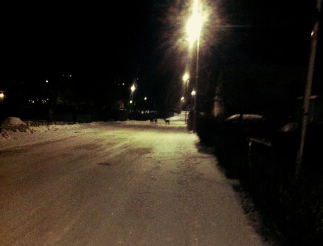 Efter att alla barn somnat så gav jag mig ut. Hade precis satt på mig vantarna och skulle sätta fart ner mot spåret. Då ser jag tre rådjur en bit ner på vår gata. De står helt stilla och tittar mot mig. Jag hinner ta ett dåligt kort och sedan kutar de iväg, och jag med.