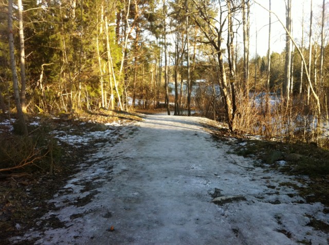 Men spåret var som en enda lång isbana. Man borde egentligen haft skridskor och hjälm på sig. Förutom att det är halt är det ju lätt att vricka foten med alla ojämnheter i isen. Men jag är i alla fall evigt tacksam för att jag inte snålade utan köpte mina Icebugs som har fäste till och med på blankis (Ledsen för all denna Icebug-reklam.) Jag sprang de första fem km av sista milen och försökte spurta i alla backar för att hålla tempot. Lyckades inte riktigt på sina ställen. Efter Aborrbacken tog jag ett par minuters vila, sen fem km till. Därefter 2 min vila innan jag sprang de sista fem.