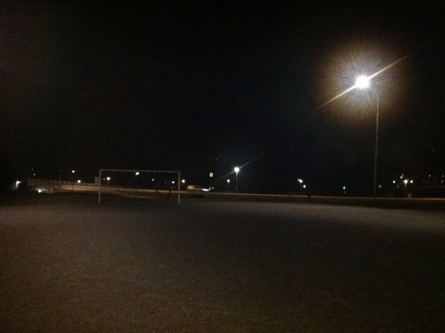 På vägen hem stannade jag till på fotbollsplanen som väntar på att ungar ska kuta runt där igen. Min mobil gjorde inte det poetiska strålkastarljuset rättvisa. Övergivna fotbolls- och basketplaner är ju bland det snyggaste som finns.