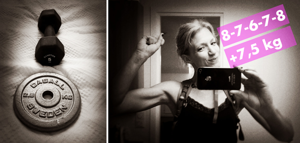 Nu ska jag minsann få till mina 20 chin-ups på raken! Ökade på innehållet i ryggsäcken till 7,5 kg och körde serien 8-7-6-7-8. På slutet var det kärvt, fick ta ett par sekunders vila innan de fyra sista. Tror detta var mina sista chins innan LÖRDAG, eller så hänger jag lite på torsdag också. Kör dock aldrig oftare än varannan dag.