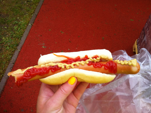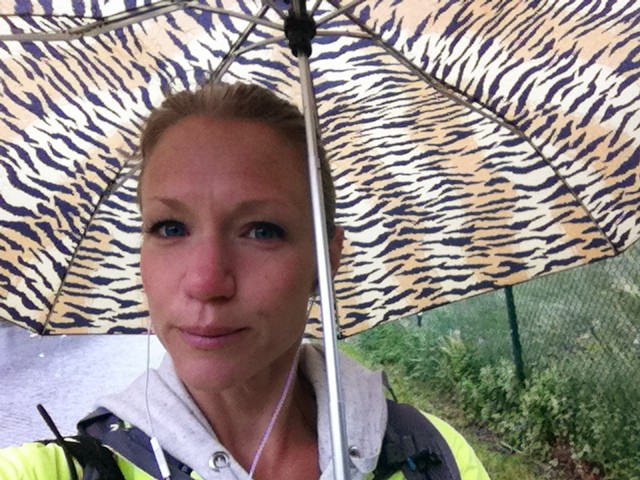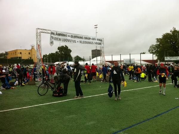 Framme på Östermalms IP var det en bedrövlig syn. Alla gick runt i olika påslösningar som skydd mot regnet. Lämnade in mina värdesaker ganska direkt (därav avsaknad av bilder från och med nu) och trängde in mig i omklädningsrummet. Insåg att ALLA hade långa tights och långärmat på sig och jag fick lite ångest. Tog av mig och gick ut och provsprang med shorts och linne och mina nya armvärmare. Ältade fram och tillbaka hur jag skulle göra men till slut då mina tänder klapprade bestämde jag mig för att dra på en långärmad tröja under linnet. Helt rätt beslut visade det sig. Och så åt jag en nötcrème. Min klädnoja gjorde dock att tiden gick och plötsligt var det dags att ställa sig i fållan. Jag älskar att stå i fållan och glo på alla! Kolla in folks dojor, kläder och stilar. Insåg att mina skor var de absolut skitigaste, inte alls någon glamour över dem då jag nyligen sprungit genom att träsk. Men pålitliga, det är de! Och så tänkte jag att vad fint det är, att här står alla människor som slitit och kämpat och tränat hela iskalla vintern. Man känner sig liksom omsluten av likasinnade.