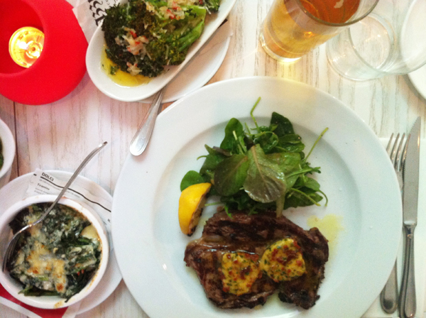 Entrecôte och öl? Ja tack! (Observera de sorgsna smörögonen på entrecôten som tittar så besviket på mig för att de vet att de ska ätas upp, men sånt är livet.)