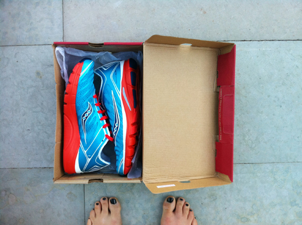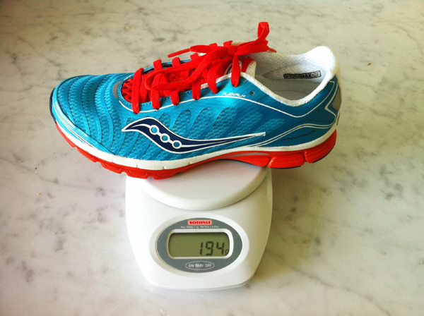 Yeay! Mina nya skor dök idag! Saucony Kinvara 3. Slet upp dem så fort jag kom hem och som tur var kunde jag pusta ut vad gäller storleken. En US 8,5 dvs en europeisk stl 40 är lagom för mina 38:or. Känns väldigt sköna! Därefter den obligatoriska vägningen: 194 gram. Nu har jag tre par skor att varva på långpassen (Adizero Boston, Nike Lunaride och så Saucony Kinvara). Och sen mina Adizero Adios för kortare pass. Hade tänkt att ta vila från löpningen idag men kan hända att jag inte kan mostå en liten sväng.