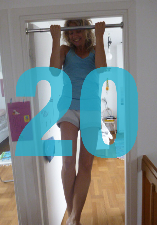 Åt en Nutellamacka för att inviga semestern. Nutella, det fick man ju bara äta när man var liten och var utomlands och hade turen att hitta såna där små förpackningar på hotellfrukosten. Häromdagen spanade jag in det i affären och plötsligt hade jag köpt burken. Hur som, efter mackan var det dags för chins. Kände mig stark redan från start, måste varit Nutellan. Jag hade bara tänkt göra lite chins som vanligt men så plötsligt var jag uppe i sexton… sjutton… arton… nitton… och tjugo! Jaaaa! Äntligen! Känns ju extra bra för mitt mål var ju att klara tjugo på raken till sommaren – och den börjar ju imorgon. Det var i sista stund. Hur ska detta firas? Kanske med en till Nutellamacka.