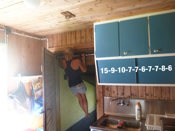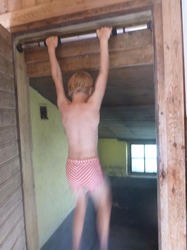 Jag har redan efter tre dagars semester vuxit fast i mina jeansshorts. Förra sommaren hade jag jeansshorts på mig varje dag, fast att det regnade. Som tur är har jag fyra stycken jeansshorts med mig i år, har kommit fram till att det är det optimala plagget på landet. Det är bra när det är varmt och kallt, man kan cykla, man kan harva runt i dem i trädgården och klippa buskar och man kan ha dem på stranden om man bara känner för att sitta och hänga och inte bada. Och man kan styrketräna och göra chin-ups i dem. Som idag. Jag fick sällskap av Ruben en kortis men sen blev jag trött på att hänga själv i ett vattenpumpsrum så jag nöjde mig med 82 stycken.