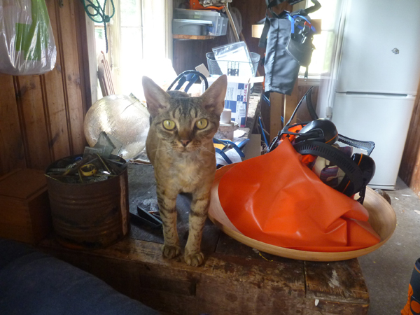 Efter lunch var det dags att ge sig ut till pumprummet och köra chins. Stången hänger bra där den hänger men det är något med vinkeln som gör det aningen jobbigare än hemma, tror det är för att jag behöver akta huvudet här, lite svårt att fatta av bilden kanske. Dessutom så skruvade den upp sig idag men som var hade vi (läs min pappa) satt fast säkerhetsbyglarna under. Så jag överlevde! Gjorde totalt 101 stycken. Lite ensamt här ute vid pumpen, tur att Ali, Kuba och Selma (syrrans katt) håller mig sällskap.