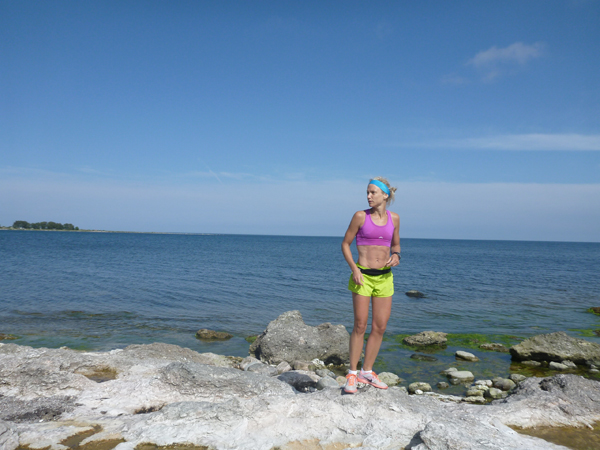 Det är en otroligt skön känsla att ha kört ett tufft pass på morgonen och sedan ge sig av på ett distanspass framåt eftermiddagen. Ingen press utan bara låta benen göra det som de gillar: springa. Precis som de själva känner för. Benen valde att springa längs havet. Det var riktigt varmt ute, solen gassade och jag blev nästan bländad av den vita kalkstenen. Jag vände halvvägs och tog samma väg tillbaka, 11 km totalt. En grej som man ska försöka unna sig när man kan, särskilt när man är på ett så vackert ställe som Gotland, det är att inte bara kuta direkt hem utan stanna till tio minuter på något fint ställe. Jag brukar försöka planera rutten efter det när jag har de där extra minuterna. Jag hängde en stund på stenstranden nära oss. Sen joggade jag hem, där var det full ruljans med gräsklippning och jag fick kaffe och en chokladmuffins i efterskott.