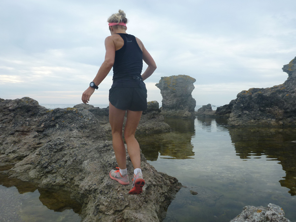 Sov dåligt i natt. Vände och vred på mig och så mörkrädda barn som traskade fram och tillbaka mellan sängarna. Var lite trött när jag vaknade men bestämde mig ändå för att gå upp. Det har blivit till en sån rutin att vara uppe med tuppen och jag mår bra av det. Idag distans på schemat. Benen kändes lite trötta och jag lät dem bestämma farten, ca 4:53-tempo i halvdisigt väder. Benen kutade på men ingen lätt känsla i kroppen idag. Men ändå: mitt i lunken så var det som att jag plötsligt såg mig själv utifrån, hur jag sprang runt i allt det här vackra och jag fick en sån impuls att ta in allt det fina, att inte bara springa här och ta det för givet. Klättrade upp på miniraukarna och försökte fylla hela minnet med havet, raukarna, luften, stigarna, stenarna, temperaturen, fåglarna, kaninerna. 18 km.