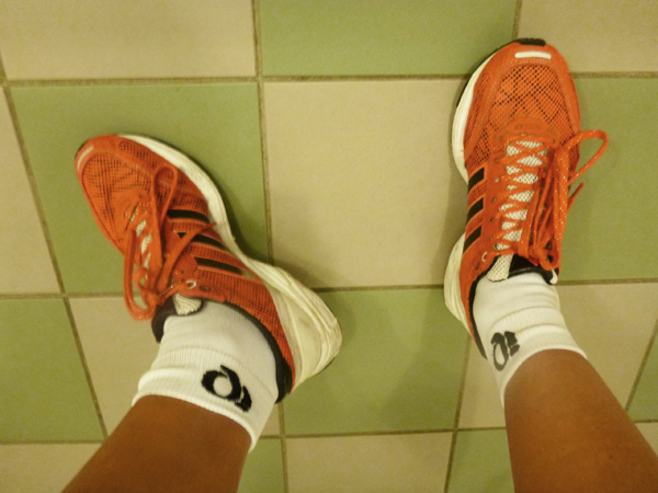 Fredagslöpning hem efter jobbet. Nu kändes det i benen att de var trötta efter intervallerna. När jag skulle byta om insåg jag att jag inte hade några strumpor för Olle hade åkt hem med alla mina väskor och gamla svettiga kläder. Men! Micke var kvar och lånade så snällt ut sina strumpor. Lite svettiga efter vårt löppass men tusen gånger bättre än att få skavsår. Fick veta att de var ett par äkta cykelstrumpor, det ni!