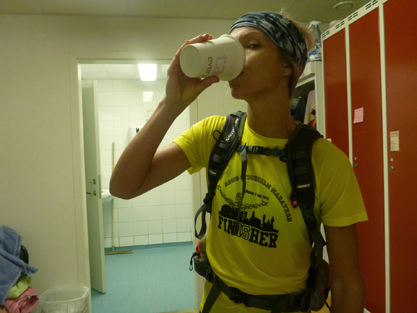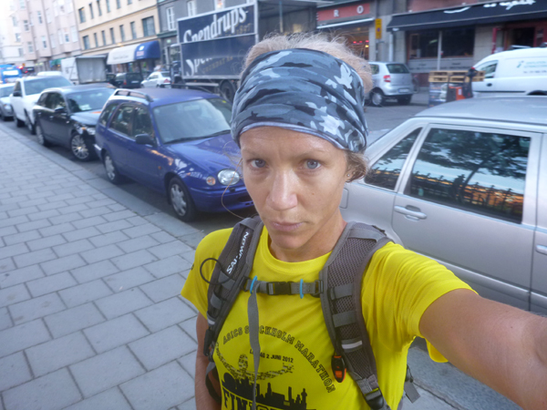 Ett par minuters pustande i den nyvakna staden. Och sen 1,5 km nedjogg fram till jobbet och kaffe. Förresten, lite kul när man köper kaffe i träningskläder och genomsvettig. Det öppnar upp många små roliga konversationer med människor. En dam jag handlat kaffe av en massa gånger tidigare men liksom aldrig ”brutit isen” med, har börjat prata med mig en massa sen jag kom dit löparklädd. Många är lite nyfikna på hur långt man sprungit, varför man springer etc. Trevligt, säger jag.