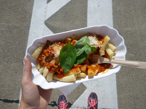 Herrejösses vad mycket folk det var. Och tusentals tröjor, tights, kompressionstrumpor, energidrycker och gudvetallt att köpa. Jag blev nästan lite nedstämd av all kommers. Till slut hade jag hämtat nummerlappen. Då köpte jag pasta bolognese och satte mig i solen ute på startbanan.