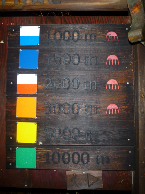 Jag hade hoppats att 5-kilometersslingan skulle vara upplyst men rymdskeppen på plankan här ovanför markerade att jag fick nöja mig med de kortare slingorna. Jag hade pannlampan med mig men ett upplyst spår känns ju som en ljus sommarkväll i jämförelse med att springa med den. Sprang först 2 km och sen 3×3 km. Totalt 11 km. Skönt med backar igen, skog och lera. Kloffs, kloffs – mina fina blåa Adios fick veta att de levde. Vågade inte trycka på alltför mycket i backarna. Just kuperat har ju varit en omöjlighet för mig under en lång tid så nu ska jag ta det lugnt.