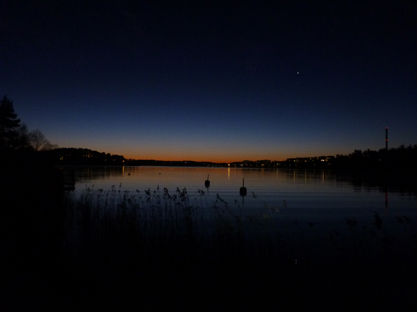 Gick nästan sönder inuti för det var så vackert ute. Tur jag har kameran då, när jag inte har någon att prata med. Det är en mäktig känsla att börja springa i totalt becksvart mörker och sen så sakta, sakta se himlen bli ljusare och ljusare. Mötte en annan löpare med pannlampa. Kunde inte se vem det var men jag kände igen springstilen, jag tror att han springer exakt samma tid varje morgon.