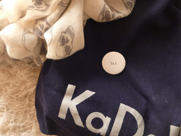 Kolla vad jag har i handden: en liten brosch jag fick på en Yoko Ono-utställning för ganska länge sen. Jag hade glömt bort den men så dök den upp igår.