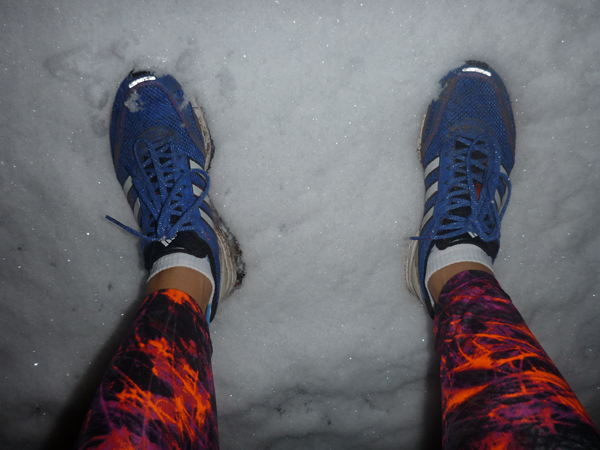 Vaknade. Tyst och mörkt. Men ändå, varför har inte klockan ringt? Jo, för att iPaden hade slut på batteri. Men som tur är har jag en inbyggd löparväckarklocka för jag hade vaknat av mig själv bara tre minuter efter utsatt tid. Upp och ut till premiärspring i snön. Det fina med att vara uppe tidigt är att man är den första som får göra fotspår i snön.