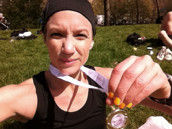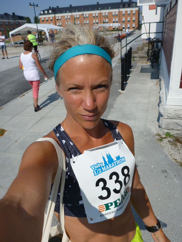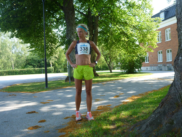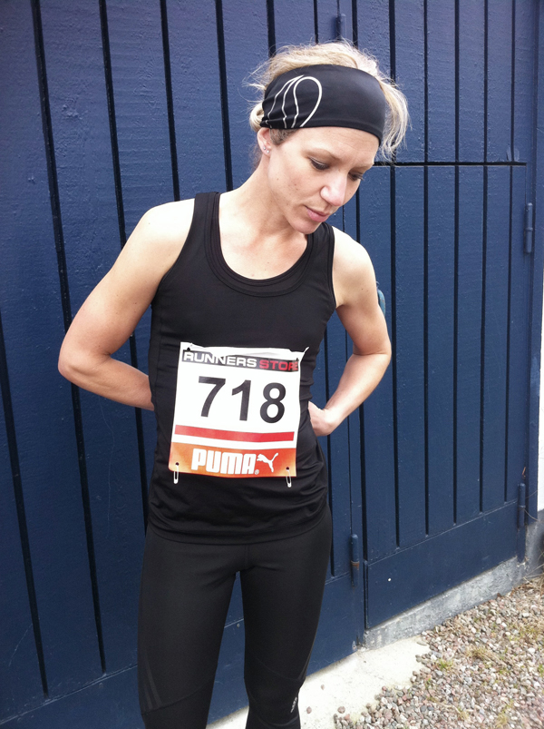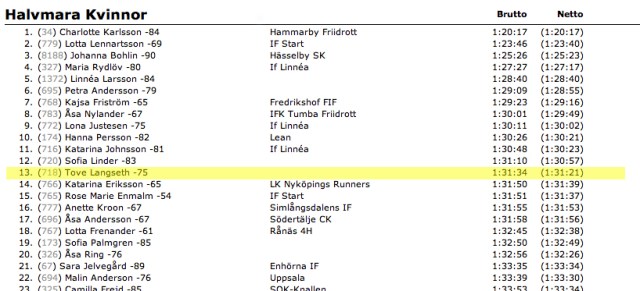 Därefter gick jag runt som en osalig ande som man brukar göra innan ett lopp. Men jag träffade en massa trevligt folk t ex Tobias (som sedan satte pers med 1:21:40!) och roliga bloggläsare som hejade. Stod och huttrade i regnet, osugen på att dra av mig överdragskläderna. Men när jag väl gjorde slag i saken och började värma upp så kändes det bra. Träffade Mikaela som vann loppet förra året och vi önskade varandra lycka till. Sen stod vi där på startlinjen, alla i sina snabbaste skor, och plötsligt var vi iväg! Full fart framåt, alltid för fort i starten men jag lyckades sansa mig och hittade raskt in i ett lagom tempo på ca 3:58 min/km. Vi sprang. Och vi sprang. Väntade på att det skulle kännas tungt men det kändes bra. En kille från Fredrikshof (jag kollade i resultatlistan och tror du heter Magnus Engström) passerade mig efter en bit och sa ”Kom igen Tove!” Jag låg sen nästan hela loppet i hans rygg (hoppas ok) och var tacksam över att inte behöva ligga så ensam som jag gjorde på Women´s Health Halvmarathon för ett par veckor sen. Plötsligt har tio kilometer gått och min klocka visar att jag fortfarande håller 3:58 min/km. För en stund tänker jag att vadsjutton, tänk om jag slår förra årets tid?! Mot alla odds?! Jag tycker att jag håller konstant fart men tappar uppenbarligen en del på andra varvet. Klockan visar 4:02 min/km mot slutet, vilket ändå känns helt ok. Under hela loppet så får jag höra alltifrån att jag är första dam till andra dam, men jag vet att jag är tredje dam. När det bara är tre kilometer kvar blir jag dock omsprungen av en tjej. Jag blir lite paff och lyckas inte ta igen det utan det är bara att räcka fram näven åt henne och tredjeplatsen. Kommer i mål som 4:a och tiden 1:26:32. En minut bättre än loppet för två veckor sen men två och en halv minut sämre än mitt pers. Blev förvånad då klockan visade en snittfart på 4:02 fast det egentligen var 4:05 min/km. Måste lära mig att skita i klockan helt. Absolut inte nöjd med denna tid, men inte heller så besviken. Jag får springa vidare (lite mindre) och hoppas att min plan framåt kommer innebära bättre tider på sikt. I mål gratulerar jag Mikaela som helt fantastiskt sprang in på en förstaplats och tiden 1:19:40! Förutom en duktig löperska är hon en otroligt trevlig människa, det har jag förstått av de tre gångerna vi träffats. Här är hon:
