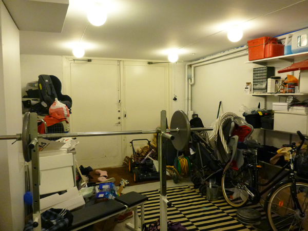Ja, det ligger alltså i vårt kedjehus och har fått namnet för att det är inrymt i garaget som på vintertid är väldigt kallt. Det är dit jag förpassat Olle och hans skivstång. Och där har han stått i vinterkylan och tränat – oerhört korta och intensiva pass har det därmed blivit! Men nu plötsligt har jag blivit lite snällare och föreslagit att skivstången kanske kunde vara i arbetsrummet istället? Något som jag för ett år sen hade tyckt var fullständigt otänkbart. Att mitt snällare jag dyker upp samtidigt som jag själv har behov av skivstången råkar bara vara ett sammanträffande, jag lovar – inte skulle jag… Såhär ser det i alla fall ut: