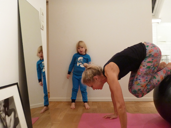 När jag ska styrketräna med min gymboll så är det som att ta fram en stor godispåse. I alla fall vad gäller Uma. Hon känner typ på lukten när jag ska träna med den, var jag än håller hus så hittar hon mig. Det är i för sig väldigt trevligt, det enda är att det är svårt att prata samtidigt som man gör ”plankan”. Och aningen svårt att göra sit-ups med en 3 1/2-åring fastklistrad på magen. Men det är gulligt när hon hämtar en fotboll och försöker hänga med i rörelserna. Vi körde styrkeprogrammet, som vanligt med mest fokus på bålpartiet.