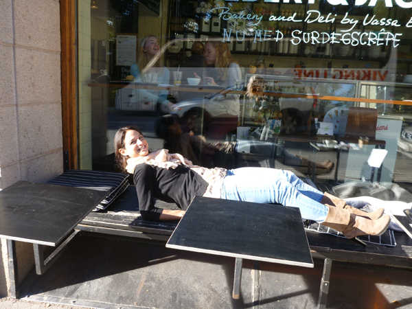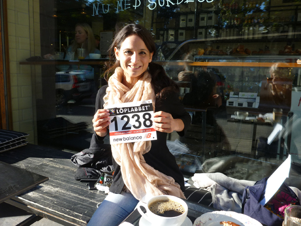 Åka in till stan och träffa Mirjam. Hon är här från Schweiz och skulle få sin nummerlapp till Hässelbyloppet som hon ska springa imorgon. Buhu, det ska inte jag så jag får vara snäll och hålla tummarna för henne istället. Vi drack kaffe och pratade (uppskattningsvis 98% löpning). Observera också att vi sitter ute, det är ändå rätt lyxigt i mitten av oktober! Vi snackade bland annat om ”plankan” och här ser ni hur Mirjam demonstrerar en bakåtvänd planka.