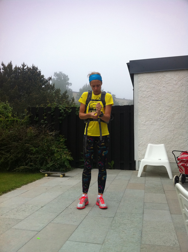 På lördagen började jag med rörlighet och magstyrka. Man kan tycka att jag borde strunta i sånt när det ändå är lördag och allt. Men nu är det ju så att naprapat-Johan sagt att rörligheten skall göras varje dags, och då är det bäst att lyda. Vad gäller magstyrkan så är det väl nyhetens behag med medicinbollen så jag kämpade mer än gärna på med den ute på gräsmattan. Sen var det dags för restan av barnaskaran att lämna oss. Ruben och Uma skulle flyga på egen hand till Gotland där min mamma väntade på dem och det kändes stort när de rullade ut från kedjehuset med sina små kabinväskor, redo för den vida världen (Nåja, nu skulle de ju inte till Peru utan till Gotland, men ändå.). Dessutom blåste det väldigt ute vilket gjorde mig lite orolig. Då är det tur att Ruben är så vansinnigt intresserad av flygplan och kan så gott som allt om detta. Han var minsann inte orolig för lite vind och lovade att ta hand om Uma. Själv skulle jag ge mig ut på intervaller och det kändes snudd på lika stort eftersom jag inte kutar det så ofta. Men nu var det dags!