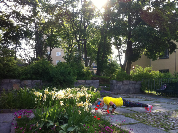 Den här veckan har jag börjat känna mig stark. Både psykiskt och fysiskt. Varje morgon har jag gått upp och kört antingen rörlighet och styrka eller rörlighet, magstyrka och chin-ups (alternativt pull-ups). Jag har inte precis skuttat upp av glädje när klockan ringt, nänä, men när jag väl legat där på mattan eller på en boll av något slag, så har det känts riktigt bra. Vissa övningar, som jag knappt kunde göra en endast av för ett par veckor sen, gör jag just nu 2×23 repetitioner av. Och då har jag insett: jag gillar känslan. Känslan av att vara stark och inte bara snabb. Jag är också nöjd med att naprapat-Johan låtit mig ta ett litet steg i taget. Som han sa första gången jag var hos honom, att det kanske inte känns så värst märkvärdigt i stunden med tio repetitioner men tänk att du gör styrkan 3-4 gånger i veckan och till sist så blir det en hel del receptioner i månaden när man slår ihop hela rasket, och dessutom lyckas göra fler och fler. Jag gillar det. Att inte hetsa, som jag annars är ganska väldigt bra på. Tror jag behöver det där vettiga just nu. Det är dock inte så att jag gått och blivit en ormmänniska, ni skulle förmodligen skratta om ni såg mig kämpa på med rörligheten. Men ändå, att jag är liiiite (läs gärna med Lidingö-i-uttal) rörligare och liiiite starkare jämfört med för fyra veckor sen, det gör att jag blivit mindre rädd om kroppen, på ett bra vis alltså. Förut kändes det som att jag skulle gå av om jag gjorde en oväntad rörelse t ex sprang ikapp med barnen. Nu kanske det bara säger knak, men utan att gå av, och det är ju ett steg i rätt riktning. Jaja, såhär har mina dagar varit denna vecka i juni: