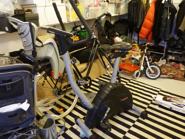 Ja herregud, ni ser ju själva. Ni undrar väl säkert vad det är som ni ska titta på bland allt bråte? Jo men det är motionscykeln rakt framför er. Den tillhör egentligen mina föräldrar men nu imorse åkte vi och lånade den av dem. Jag tycker egentligen att cykling är otroligt tråkigt men tänker ändå att jag ska trampa en del på den då jag just nu inte kan springa så mycket som jag vill. I övrigt så har jag inte haft ont i foten på morgonen på ett par dagar så det känns som ett framsteg (Obs! Göteborgshumor).