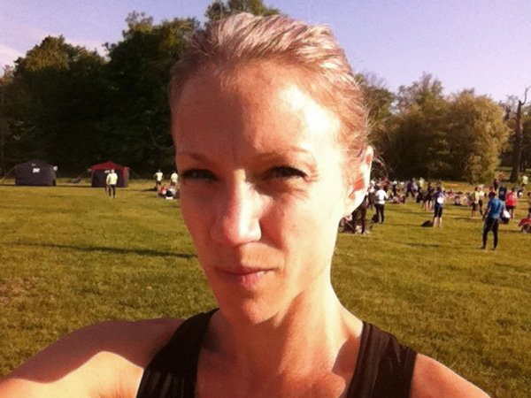 Bestämde mig för att springa i kort linne, det var ju det enda raka i den här värmen. Även om magen var (är) kritvit. Bra dock att ljuset i omklädningsrummet gör den alldeles brun.